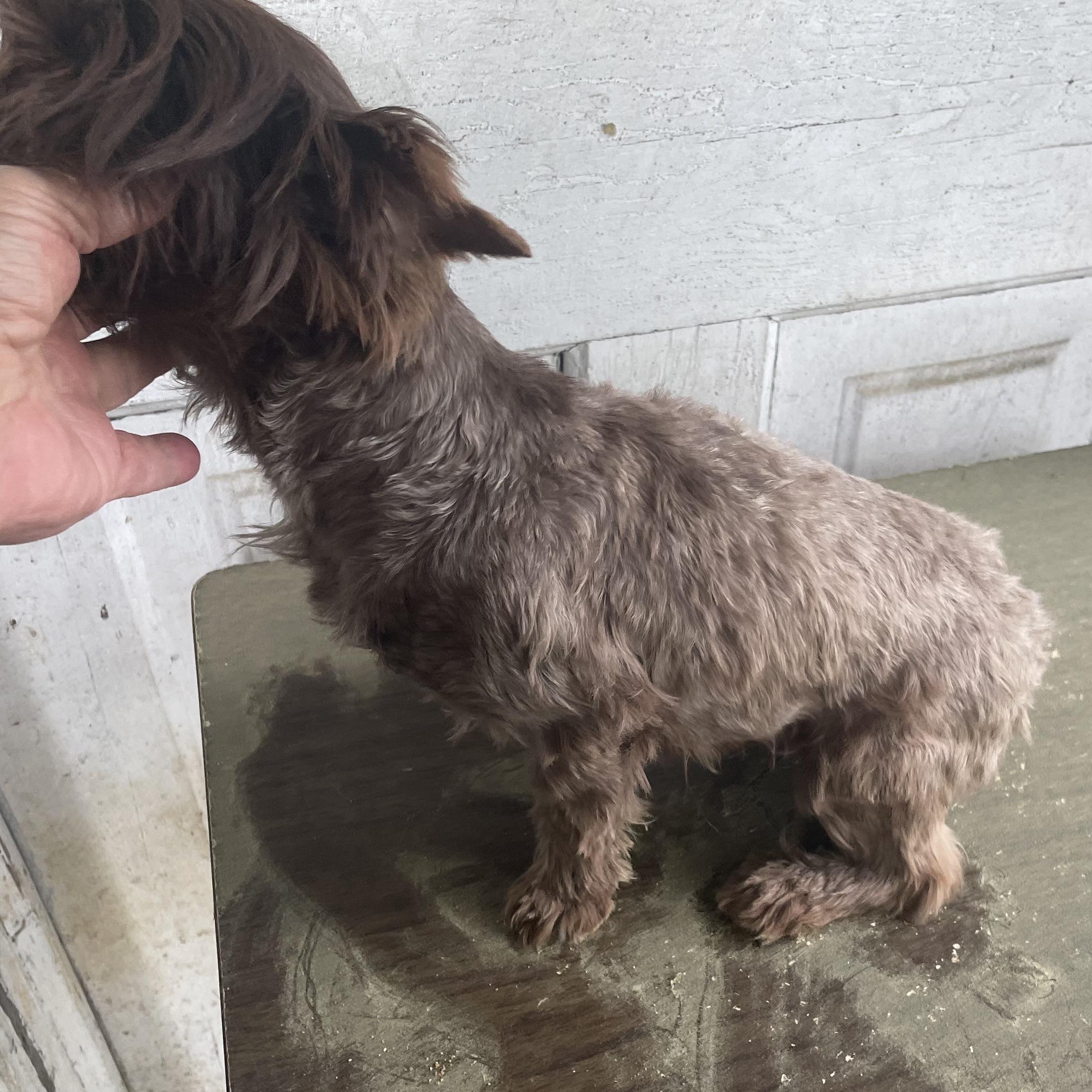 Lilo is a solid dark chocolate Yorkie, very loving and loves to cuddle, DOB 10/09/23. Summer cut.